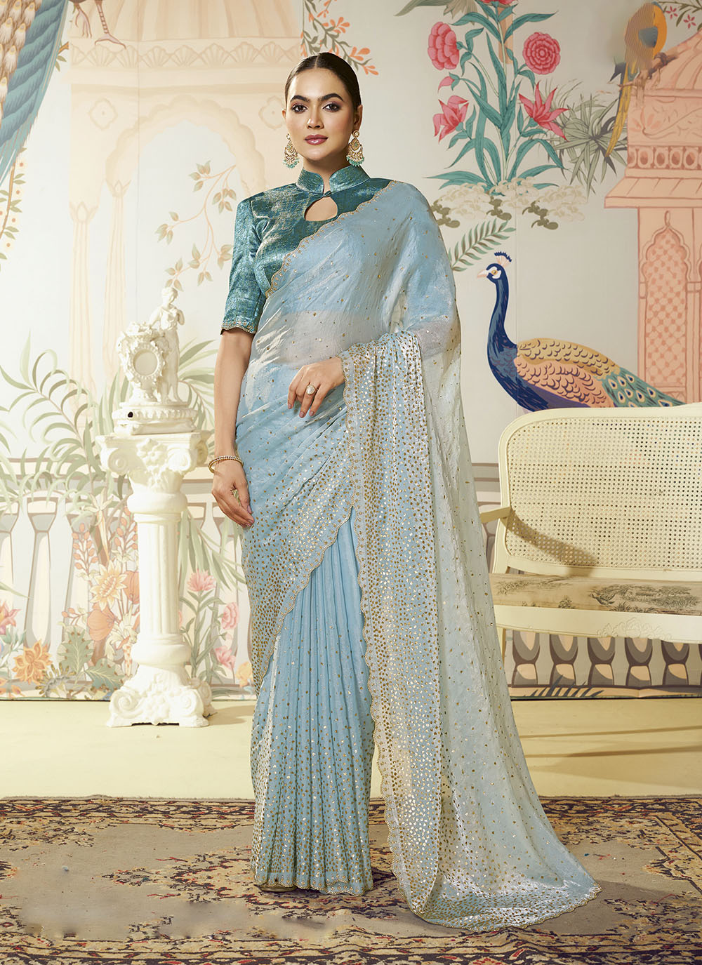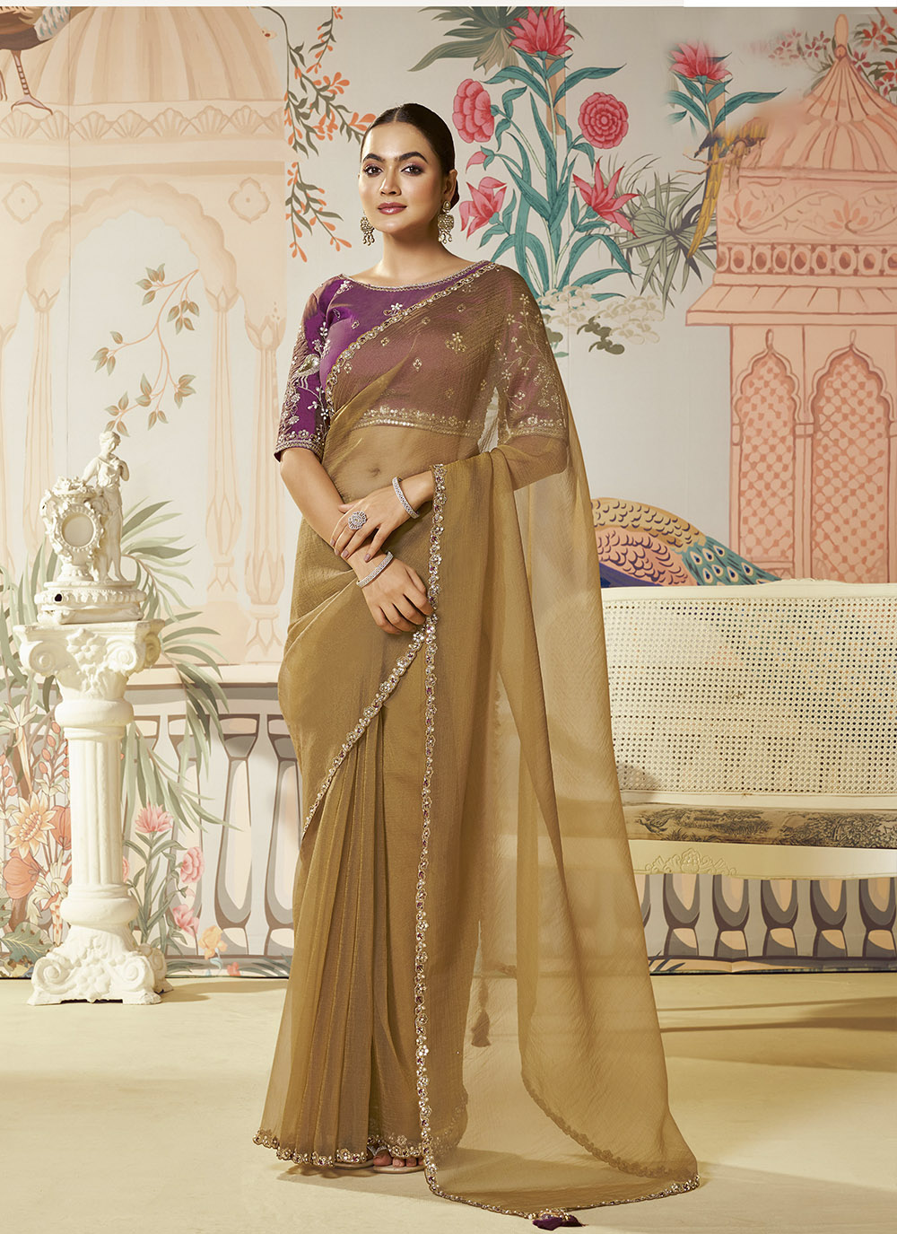 Look Attractive These Designer Party Wear Fancy Saree in Fine Colored.These Saree Are Jari Organza Silk And Blouse Two Tone Satin Silk is Fabricated.Its Beautified Fancy Dual Sequance Embroidery Work.