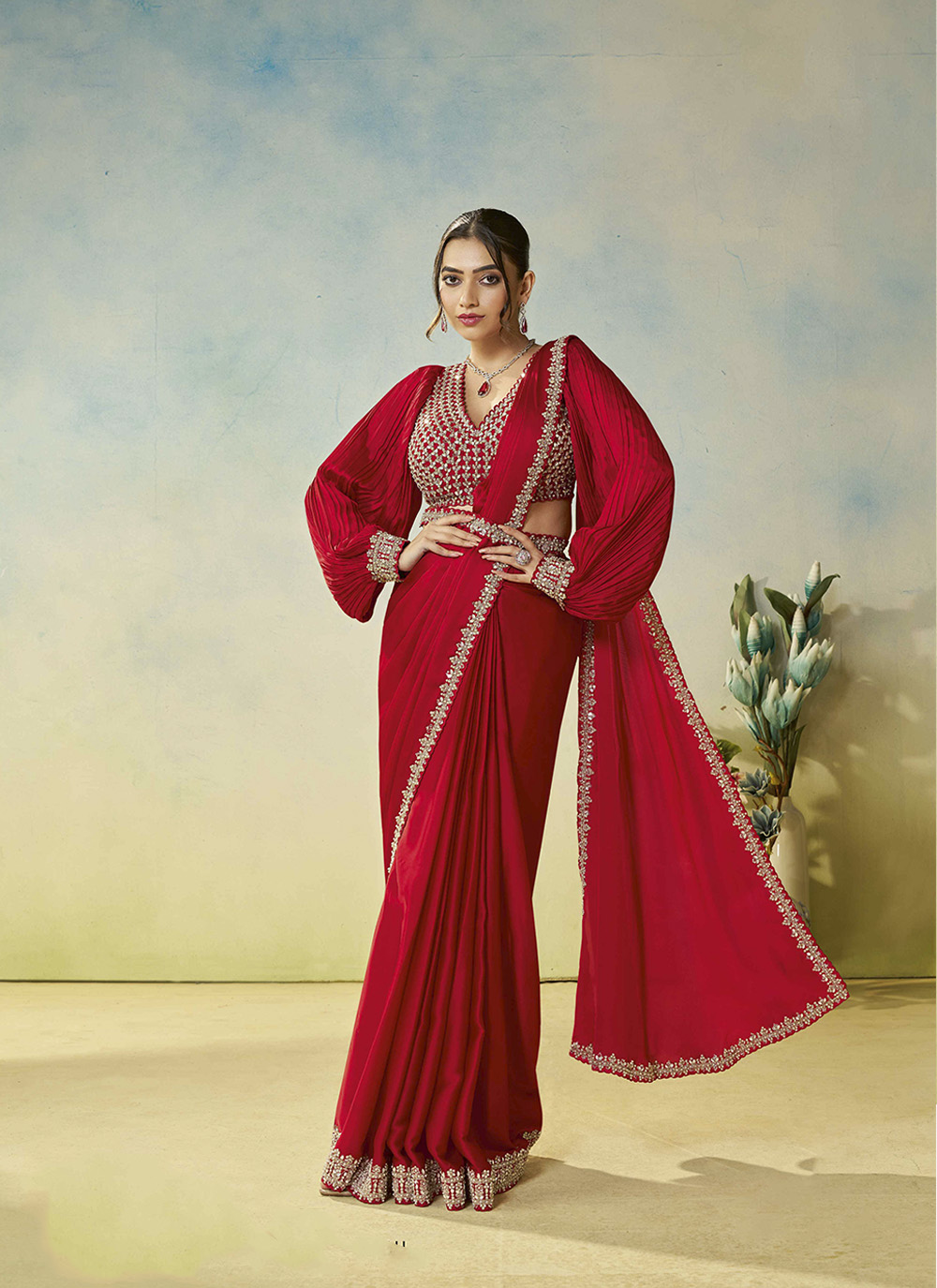Look Attrective These Designer Party Wear Fancy Ready To Wear Saree With Blouse in Fine Colored.These Saree Are Crepe Satin Silk And Blouse Malai Satin is Fabricated.Its Beautified Solid,Desiger Cord, Sequance,Thread Embroidery With Stone Moti Hand Work.