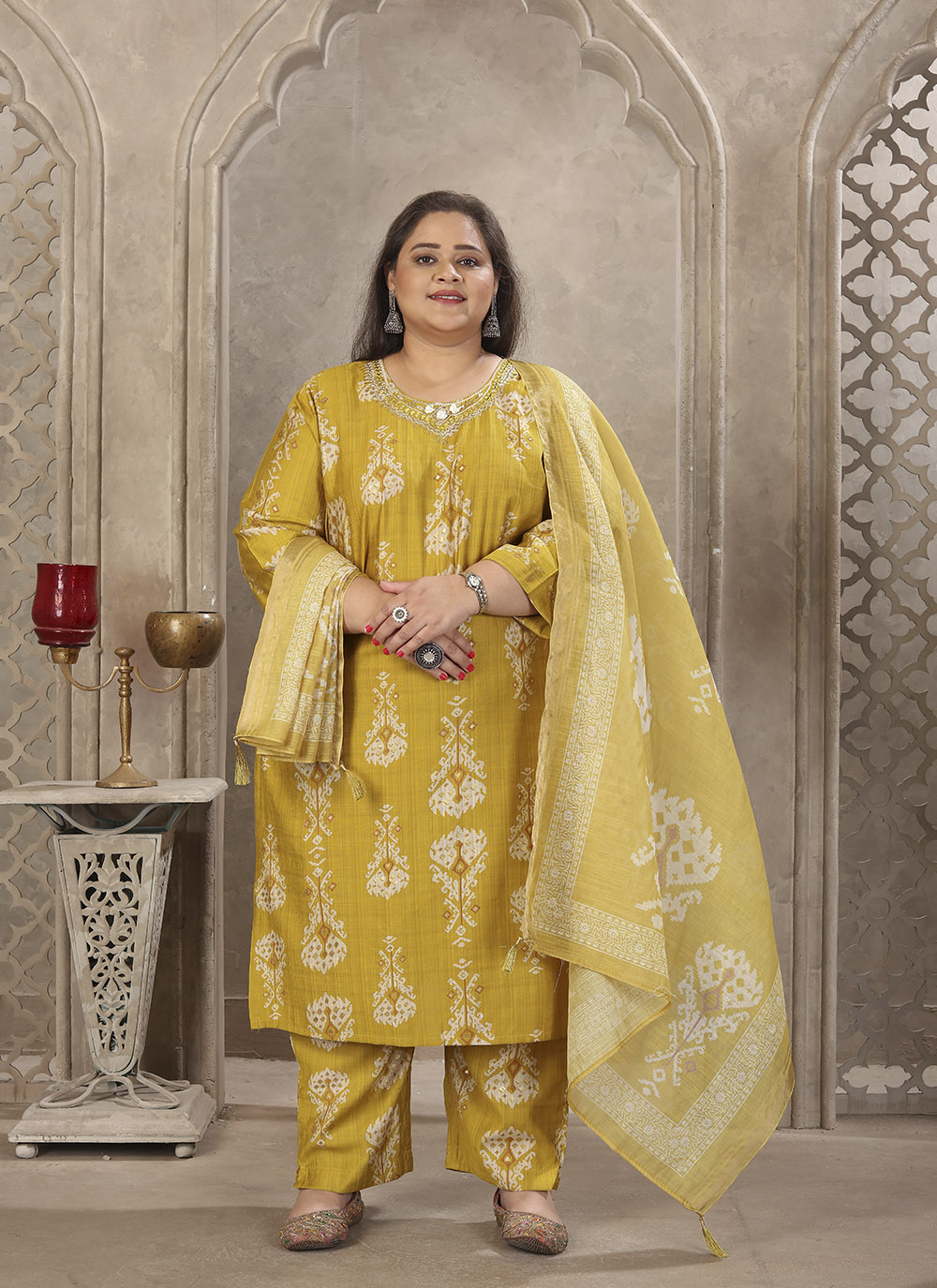Attrective These Beautiful Looking Readymade Big Size Suits.These Top And Bottom Are Lichi Viscose And Dupatta Fabricated On Linen Jacquard.Its Beautified With Designer Printed With Hand Work.