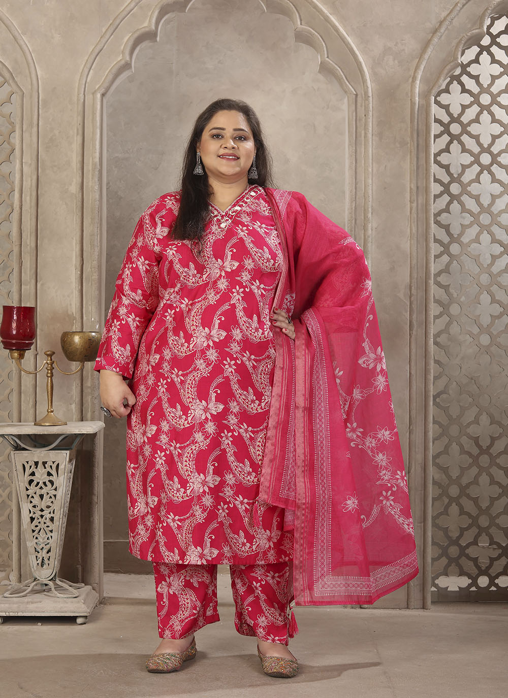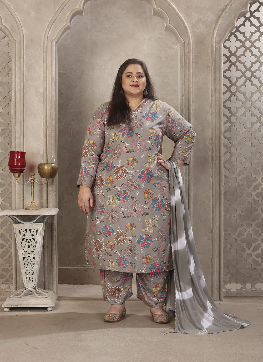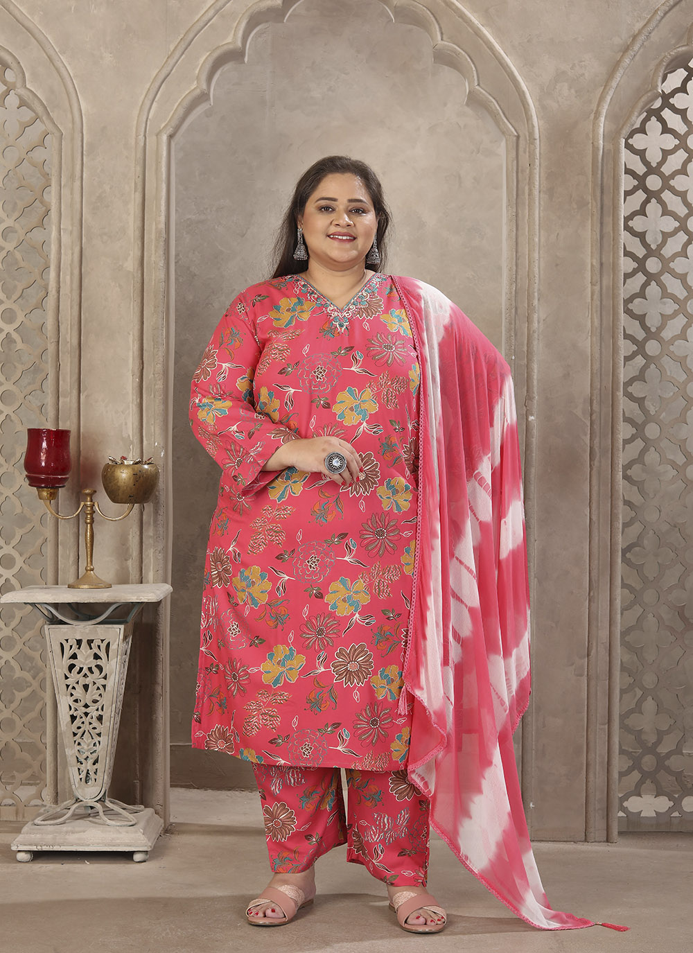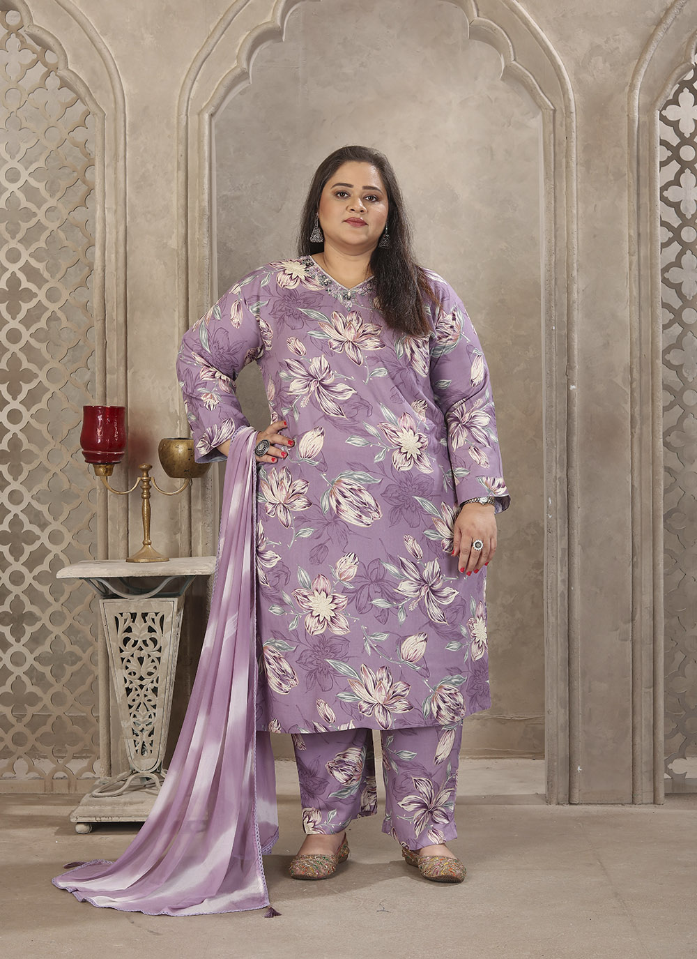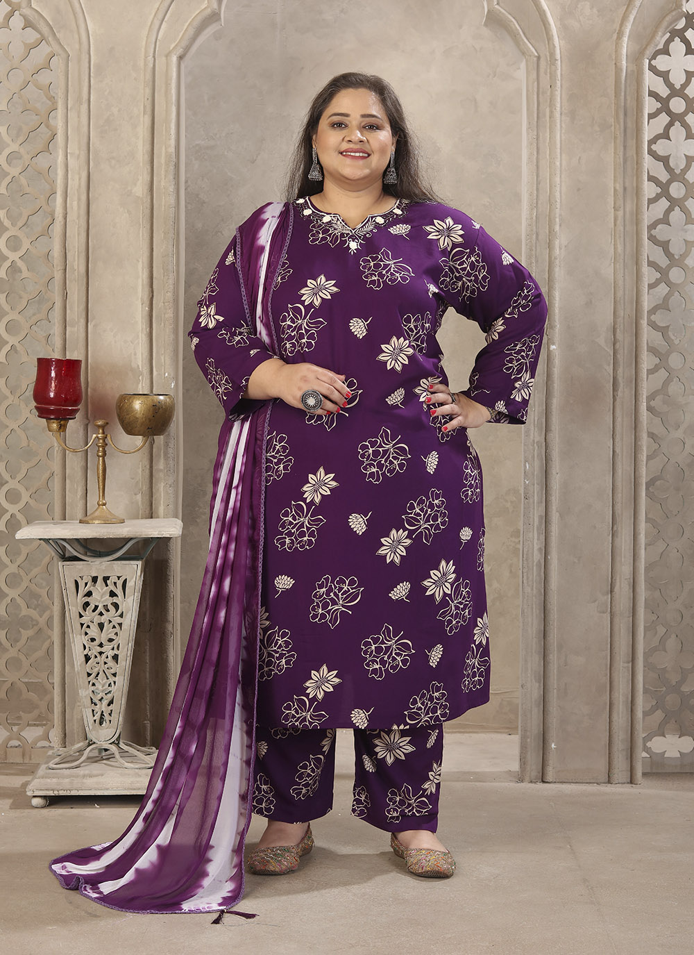 Attrective These Beautiful Looking Readymade Big Size Suits.These Top And Bottom Are Rayon And Dupatta Fabricated On Nazmeen.Its Beautified With Designer Printed With Hand Work.