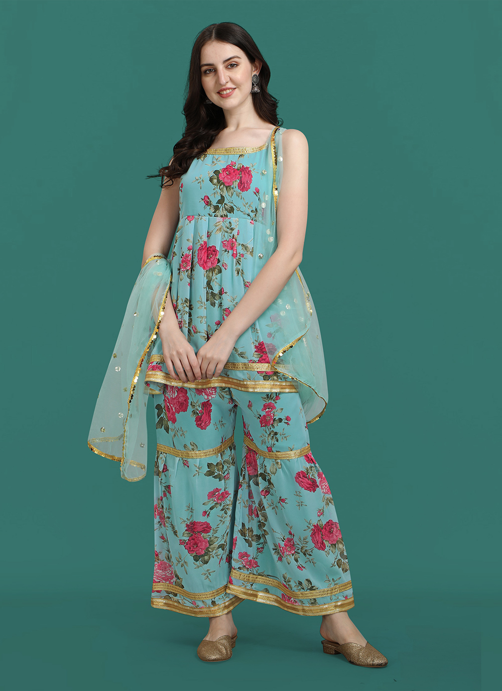 Looking These Beautiful Party Wear Readymade Sharara Suits With Dupatta.These Suit is Fabricated On Top And Bottom Are Georgette And Net Dupatta .Its Beautified With Designer Printed, Lace Work.
