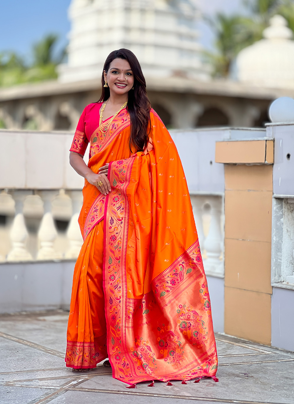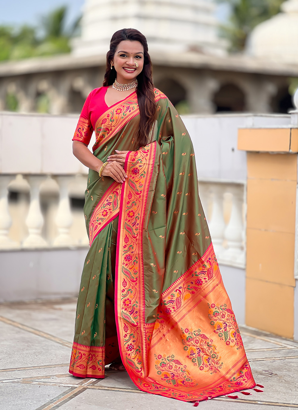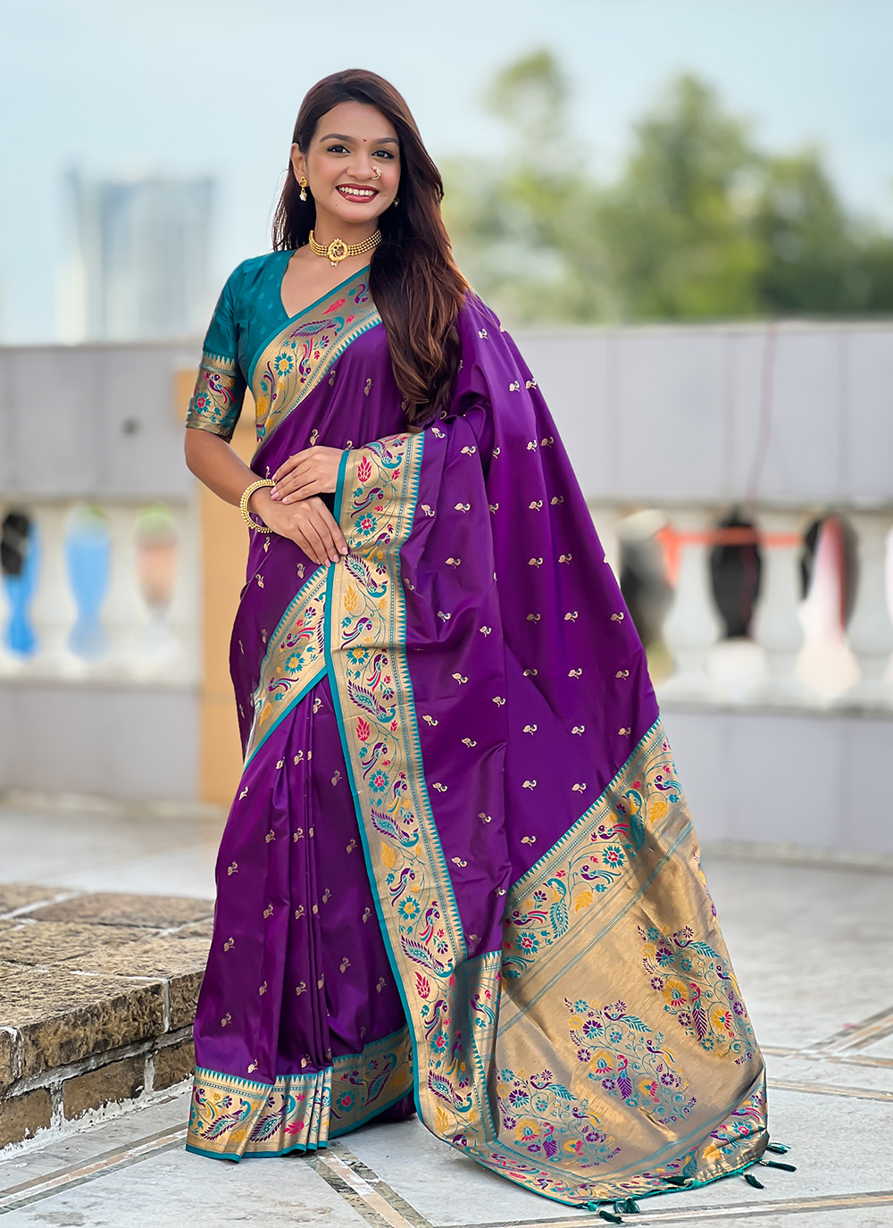 Attractive These Party Wear Saree in Fine Colored.These Saree Are Paithani Silk And Blouse is Fabricated On Paithani Silk.Its Beautified With Weaving Jacquard Meenakari Designer.