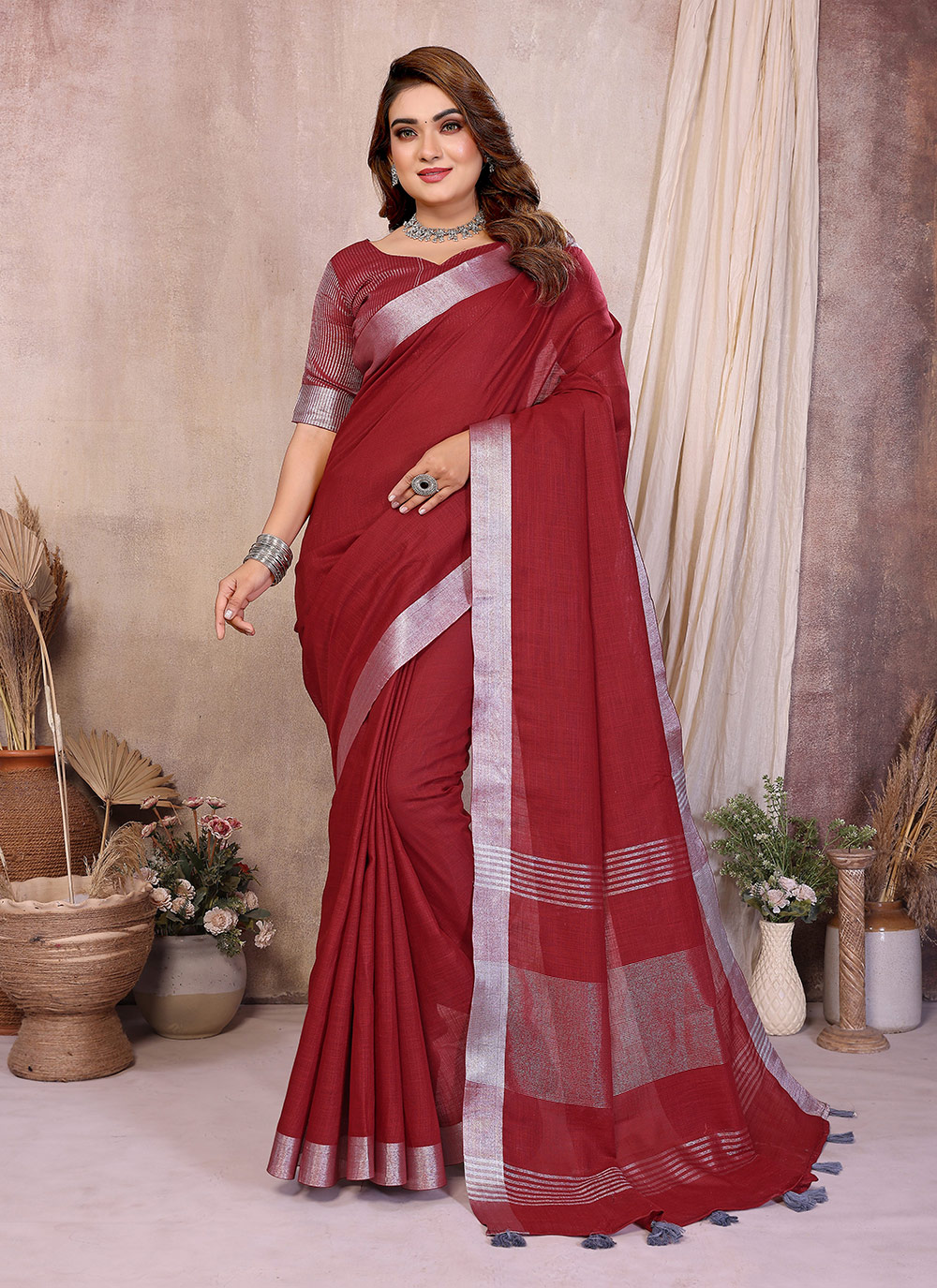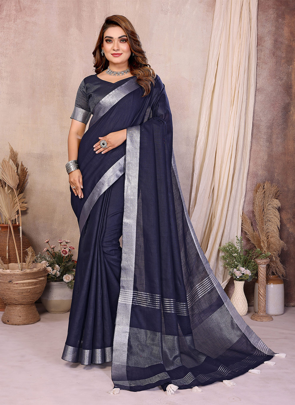 Garb These Party Wear Saree in Fine Colored.These Saree And Blouse is Fabricated On Linen Cotton.Its Beautified With Woven Silver Jari Borser Pallu Designer.