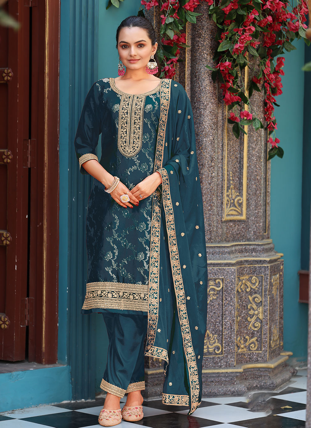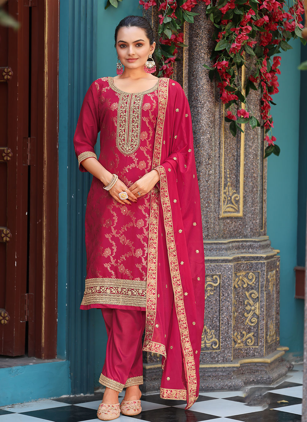 Attrective Looking These Party Wear Suit in Fine Colored Pair With Bottom And Dupatta.These Top Are Viscose Jacquard And Dupatta Are Fabricated On Chinon Pair With Santoon Bottom.Its Beautified With Woven Designer With Embroidery Work.