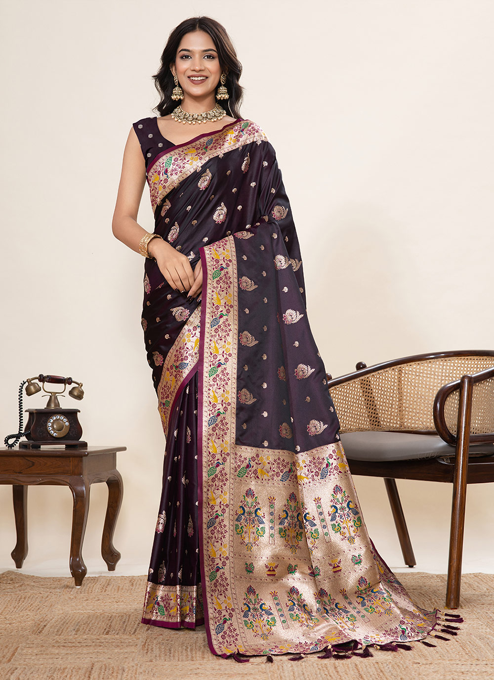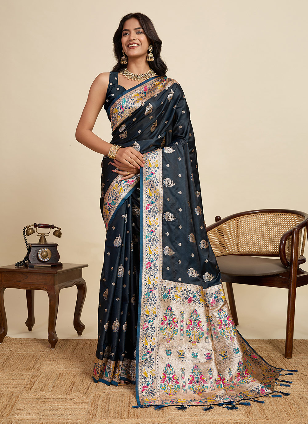 Looking This Party Wear Two Tone Saree Paired With Blouse.This Saree And Blouse Are Two Tone Satin Silk Fabric With Wevon Meenakari Designer. Buy This Pretty Saree Now.