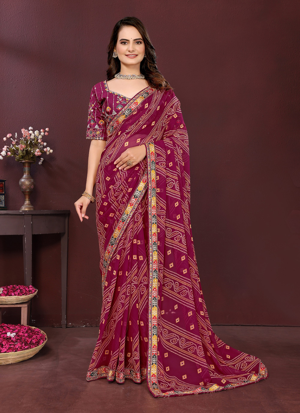 Garb These Party Wear Saree in Fine Colored.These Saree Are Georgette Are Georgette And Blouse is Art Silk Fabricated.Its Beautified With Designer Bandhani Printed With Embroidery Work Lace Border And Blouse.