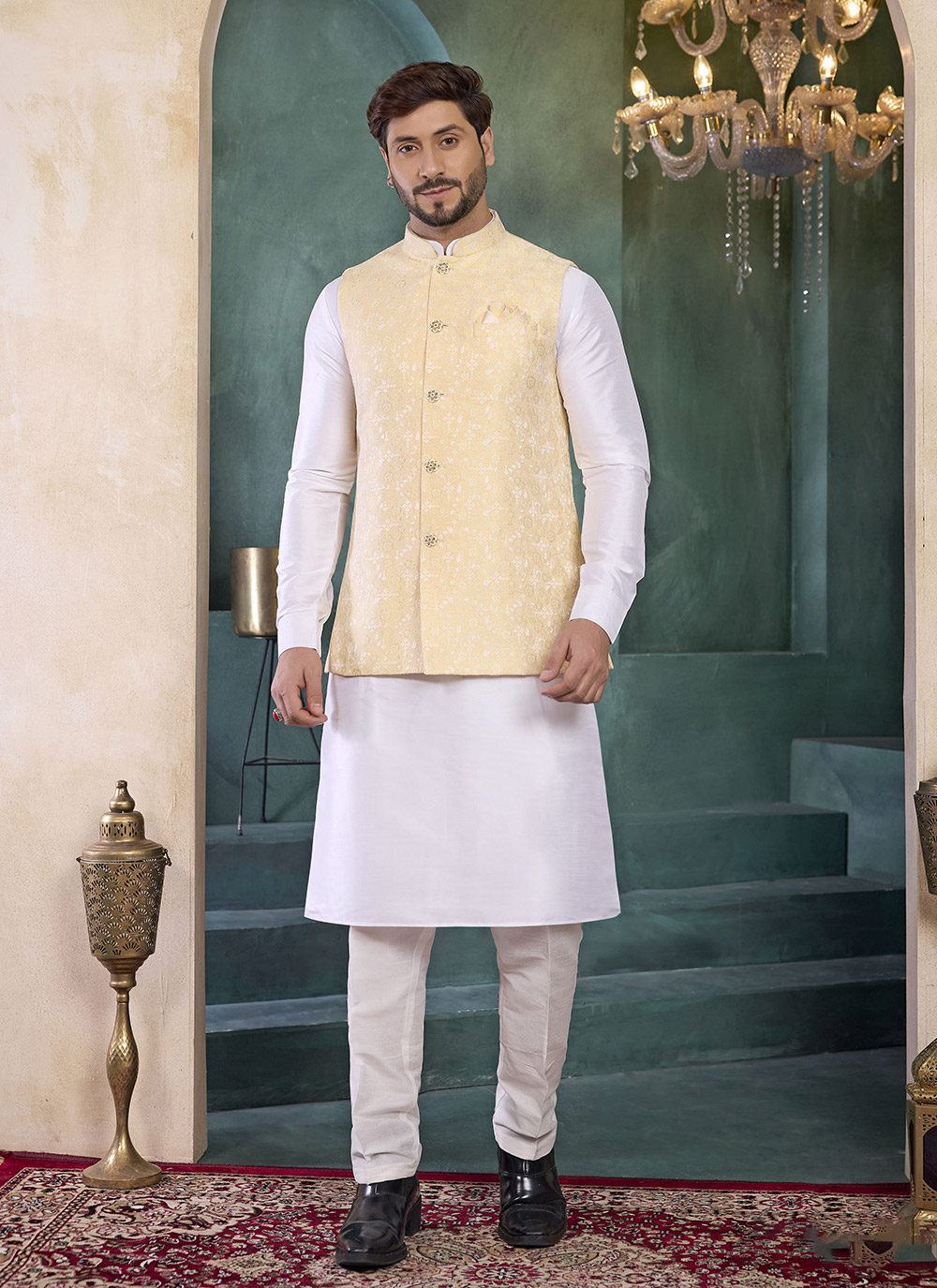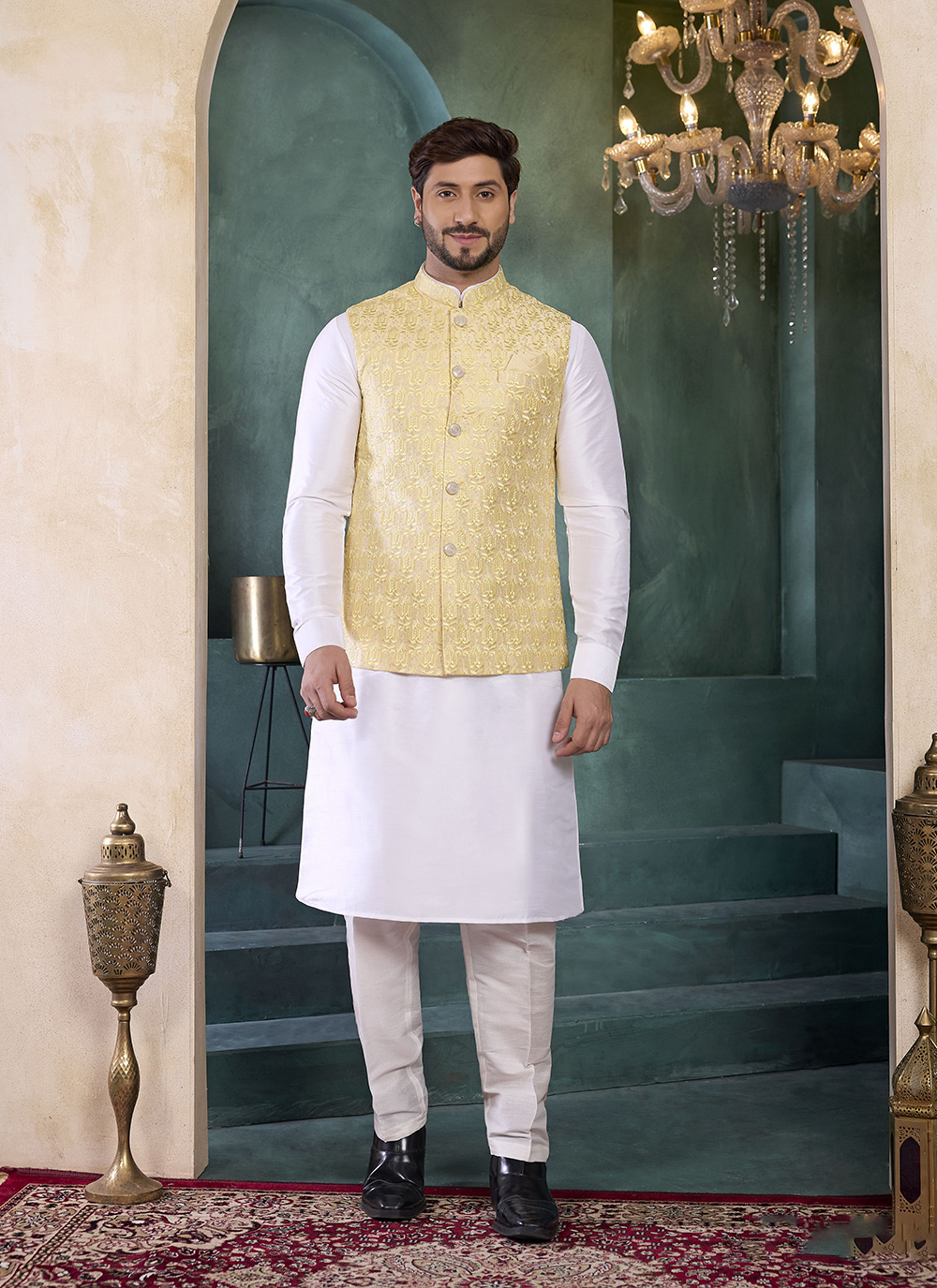Looking These Party Wear Mans Wear Top Bottom With Jacket wearing this fashionable. Tailored Top Bottom Are Banarasi Silk And Jacket On Art Silk Fabriced With Solid With Designer Embroidery Work Jacket.
