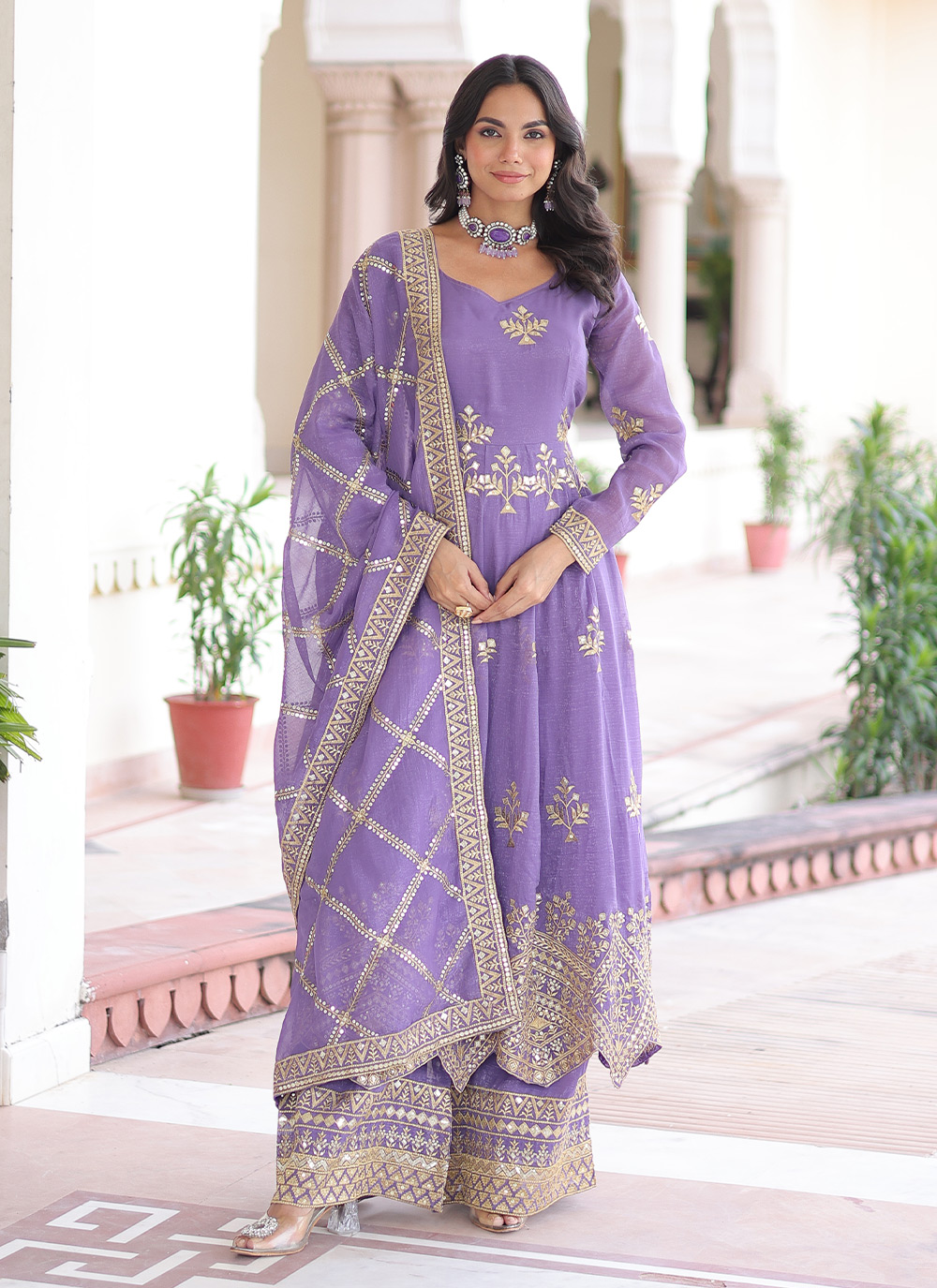 Garb These Beautiful Looking Readymade Plazzo Suit With Dupatta.These Top Bottom And Dupatta is Fabricated On Silver Crunchy.Its Beautified With Designer Sequance Embroidery Work.