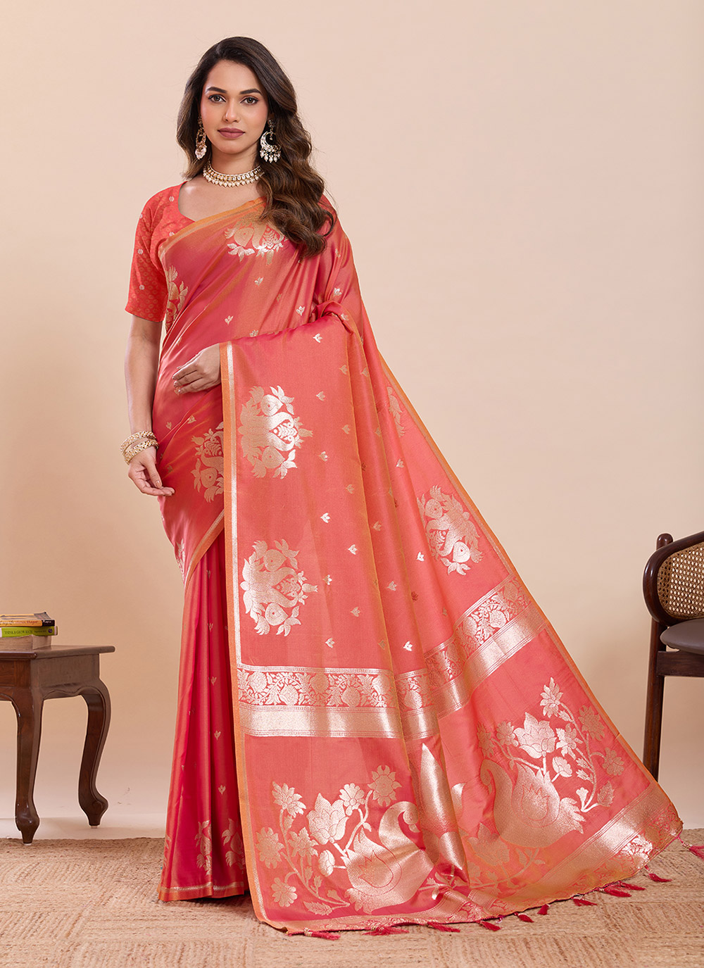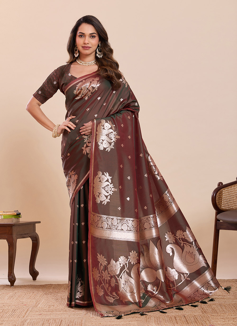Looking This Party Wear Saree Paired With Blouse.This Saree And Blouse Are Soft Silk Fabric With Woven Golden Jari Swan Designer. Buy This Pretty Saree Now.