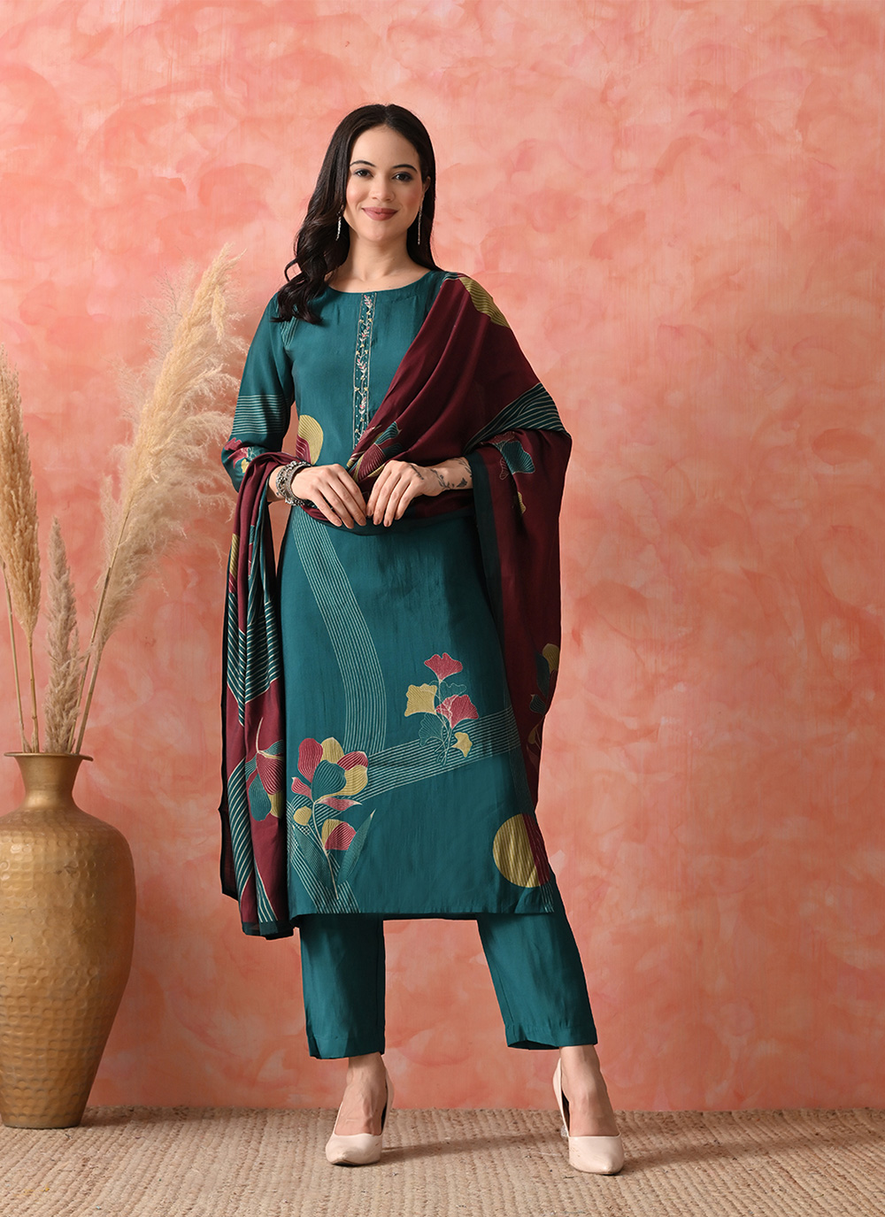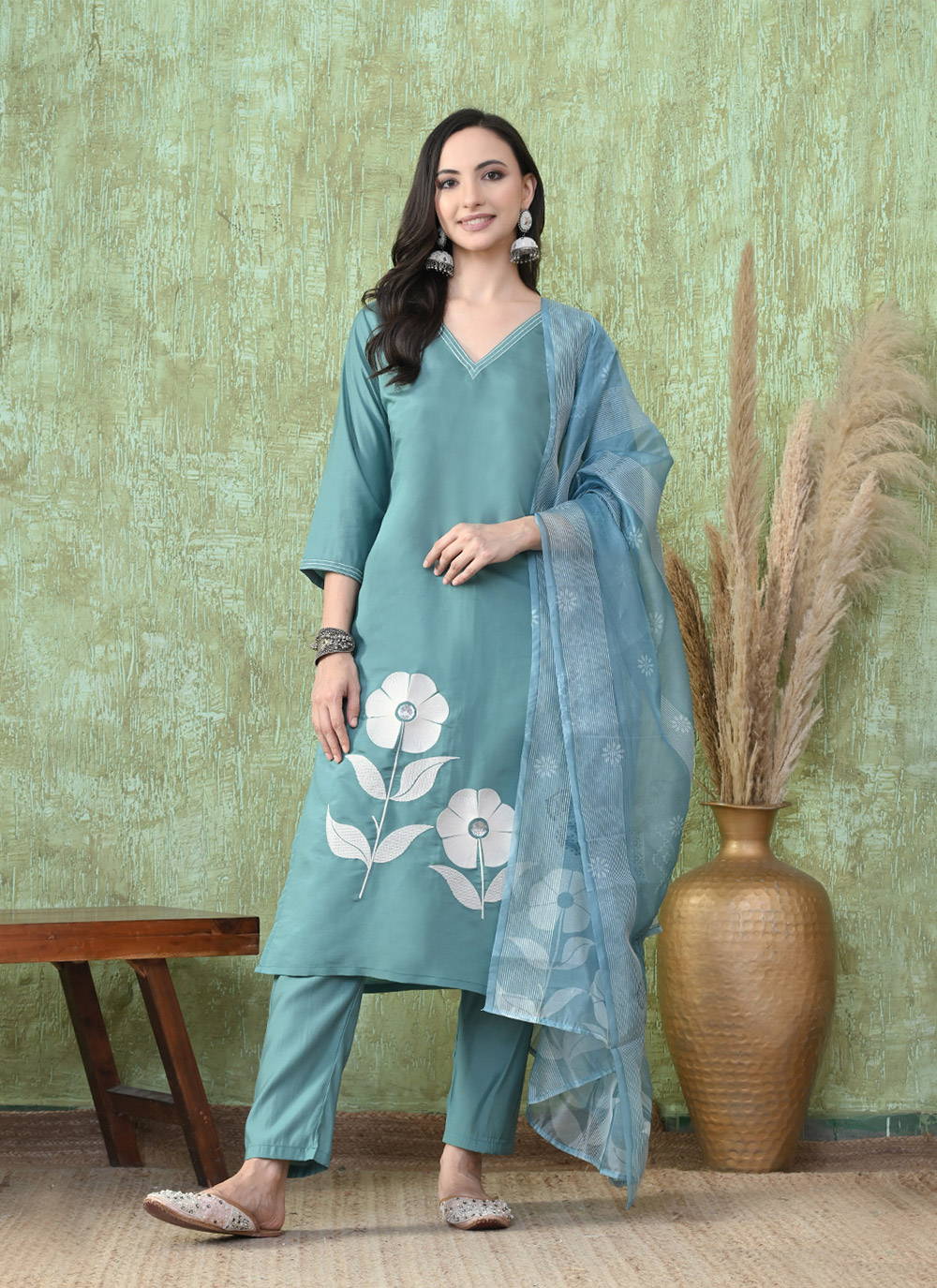 Attrective These Beautiful Looking Readymade Suits.These Top Are Roman Silk And Bottom Are Roman And Dupatta Are Organza Slub Fabricated.Its Beautified With Disigner Printed With Hand Work.