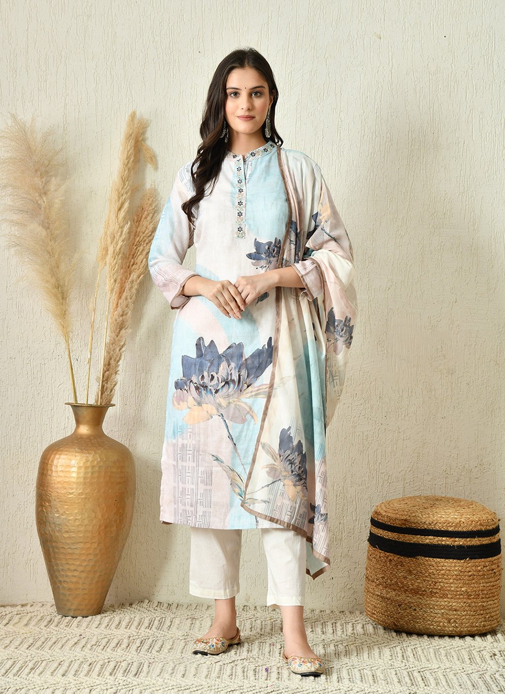 Attrective These Beautiful Looking Readymade Suits.These Top Are Linen And Bottom Are Cambric Cotton And Dupatta Are Mul Cotton Fabricated.Its Beautified With Disigner Printed With Embroidery Work.