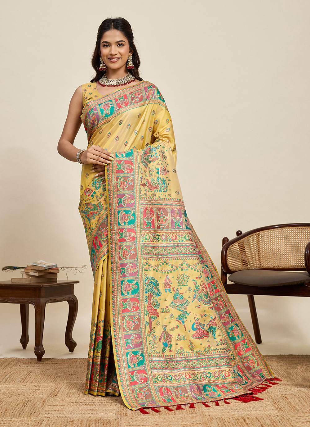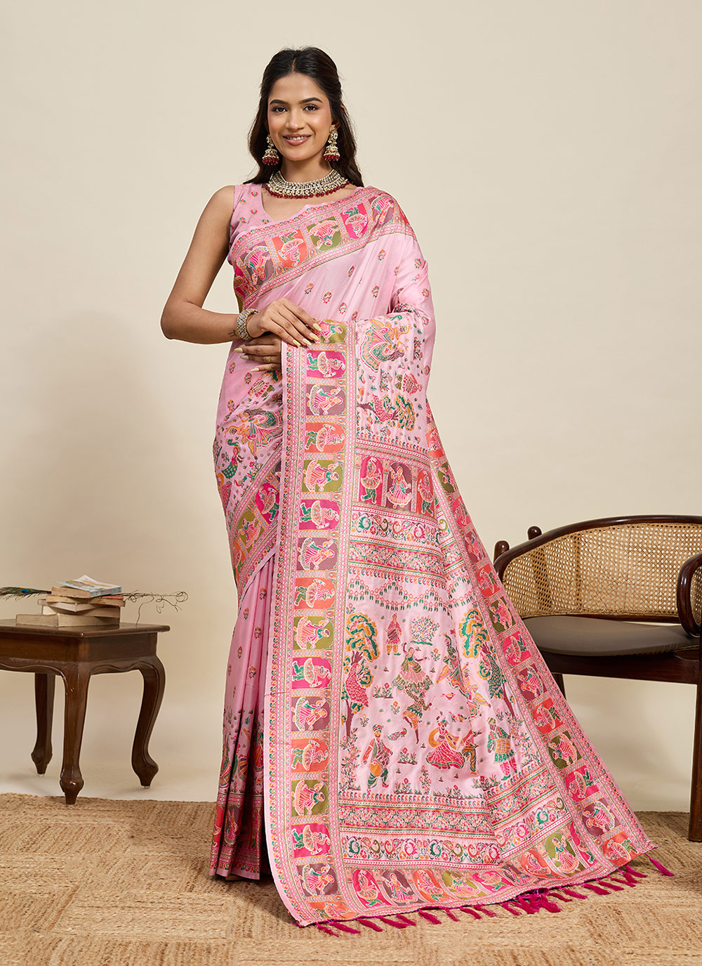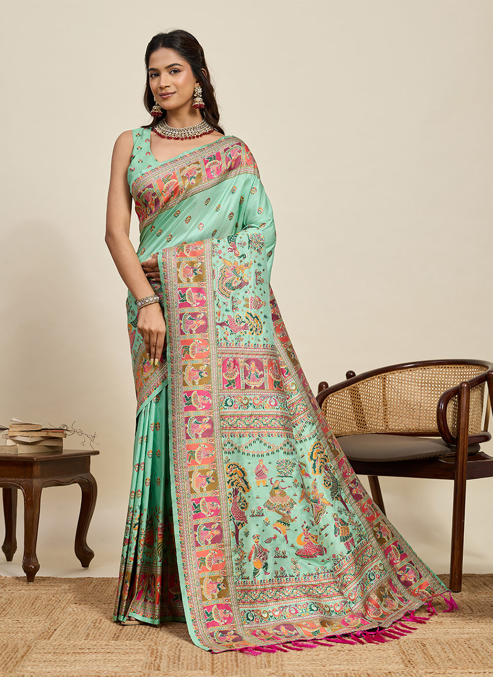 Looking This Party Wear Saree Paired With Blouse.This Saree And Blouse Are Soft Pashmina Silk Fabric With Woven Meenakari Designer. Buy This Pretty Saree Now.