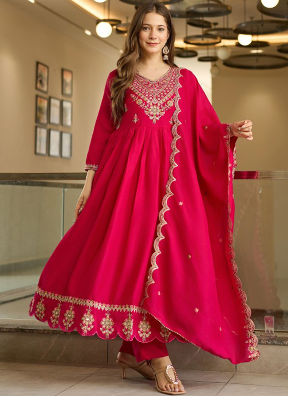 Garb These Beautiful Looking Readymade Suits.These Top Are Vichitra Silk And Bottom Are Rayon And Vichitra Silk Dupatta Fabricated.Its Beautified With Disigner Embroidery Work.