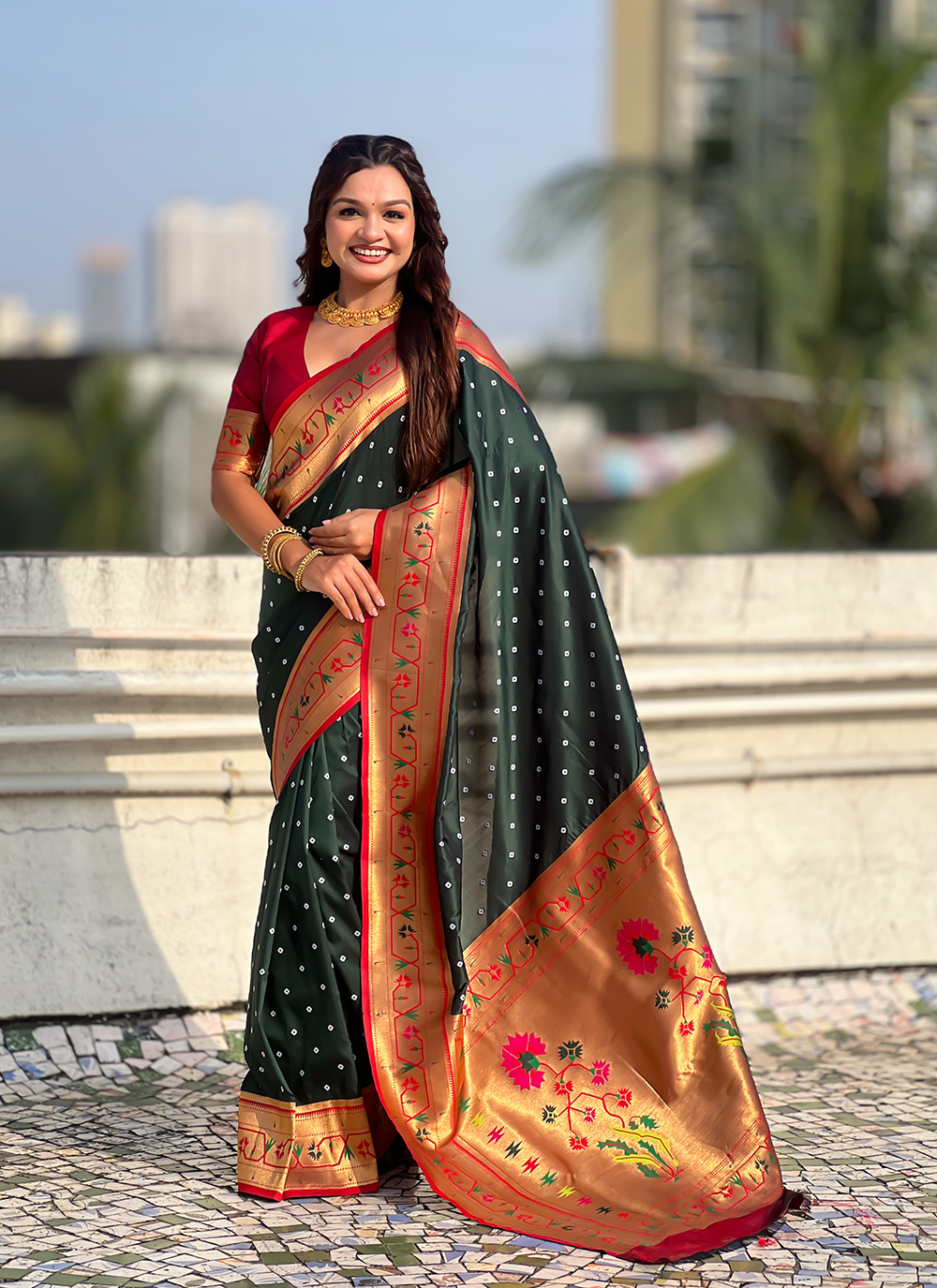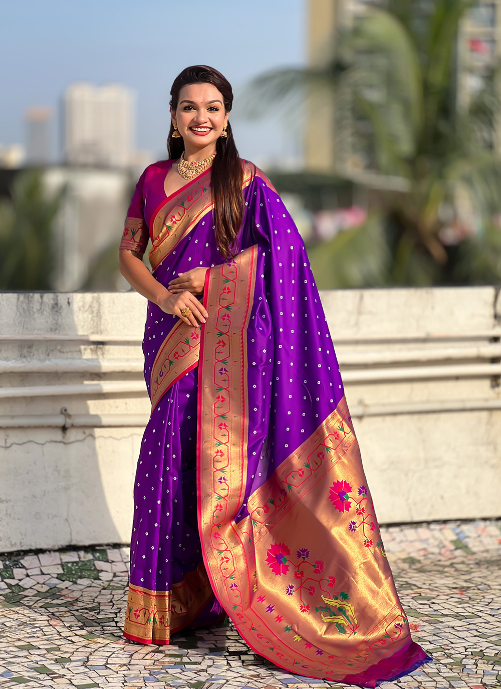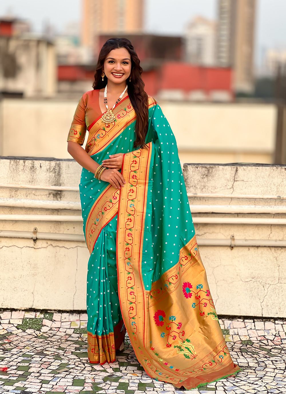 Garb These Party Wear Saree in Fine Colored.These Saree And Blouse is Fabricated On Soft Silk.Its Beautified With Weaving Bandhani Jari, Rich Paithani Meenakari Pallu Designer.
