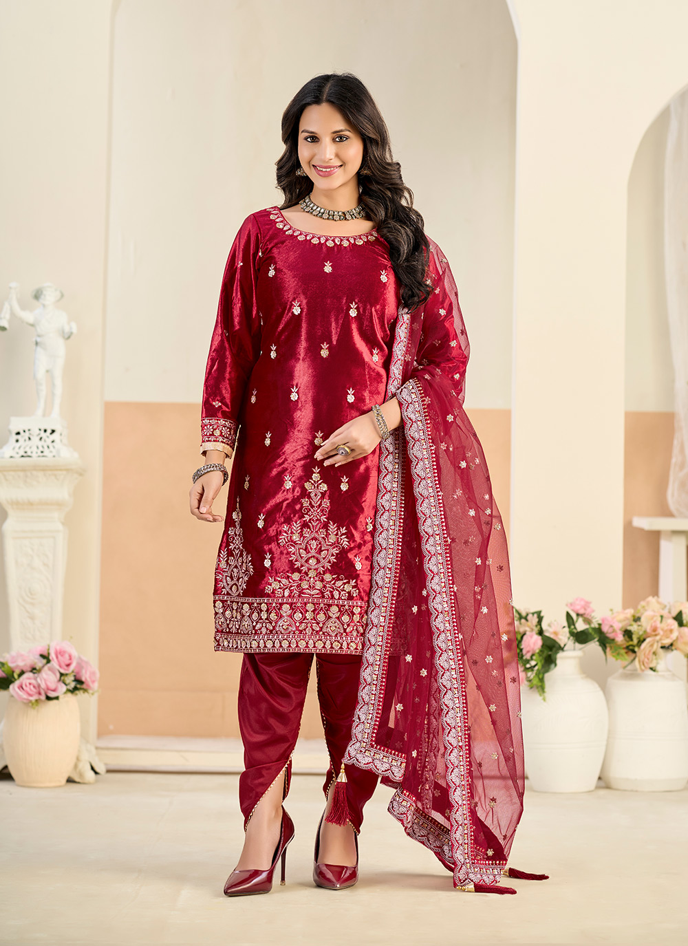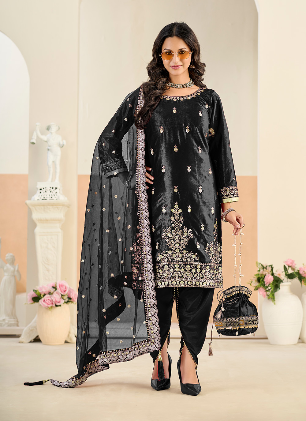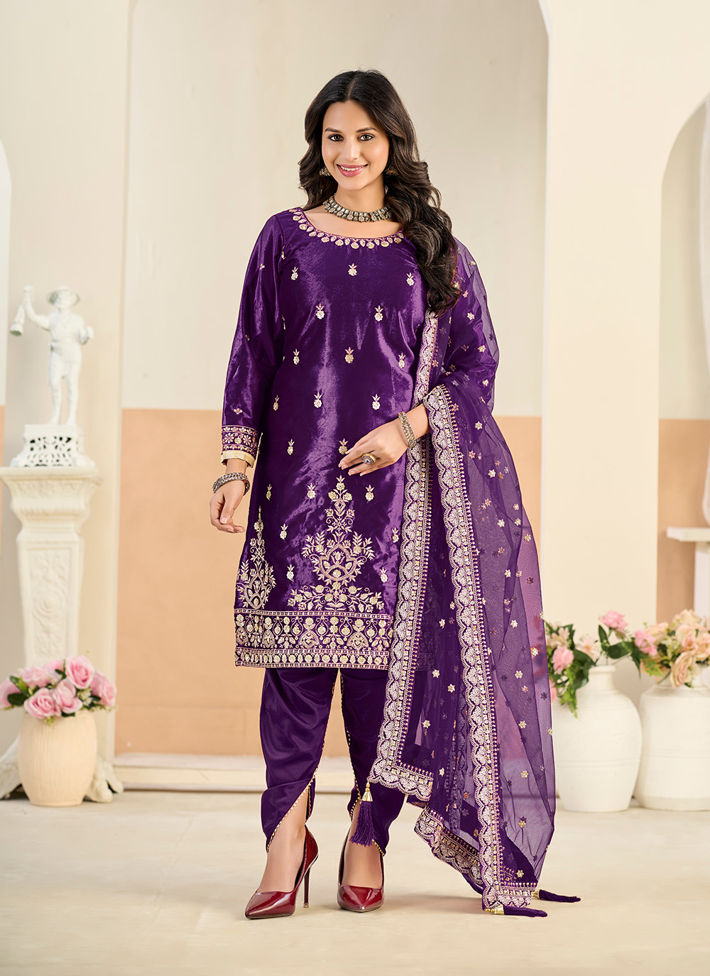 Looking These Beautiful Party Wear Fine Color Suits.These Top Are Velvet And Dupatta Are Net And Bottom Dull Santoon Fabricated.Its Beautified With Heavy Designer Embroidery Work.