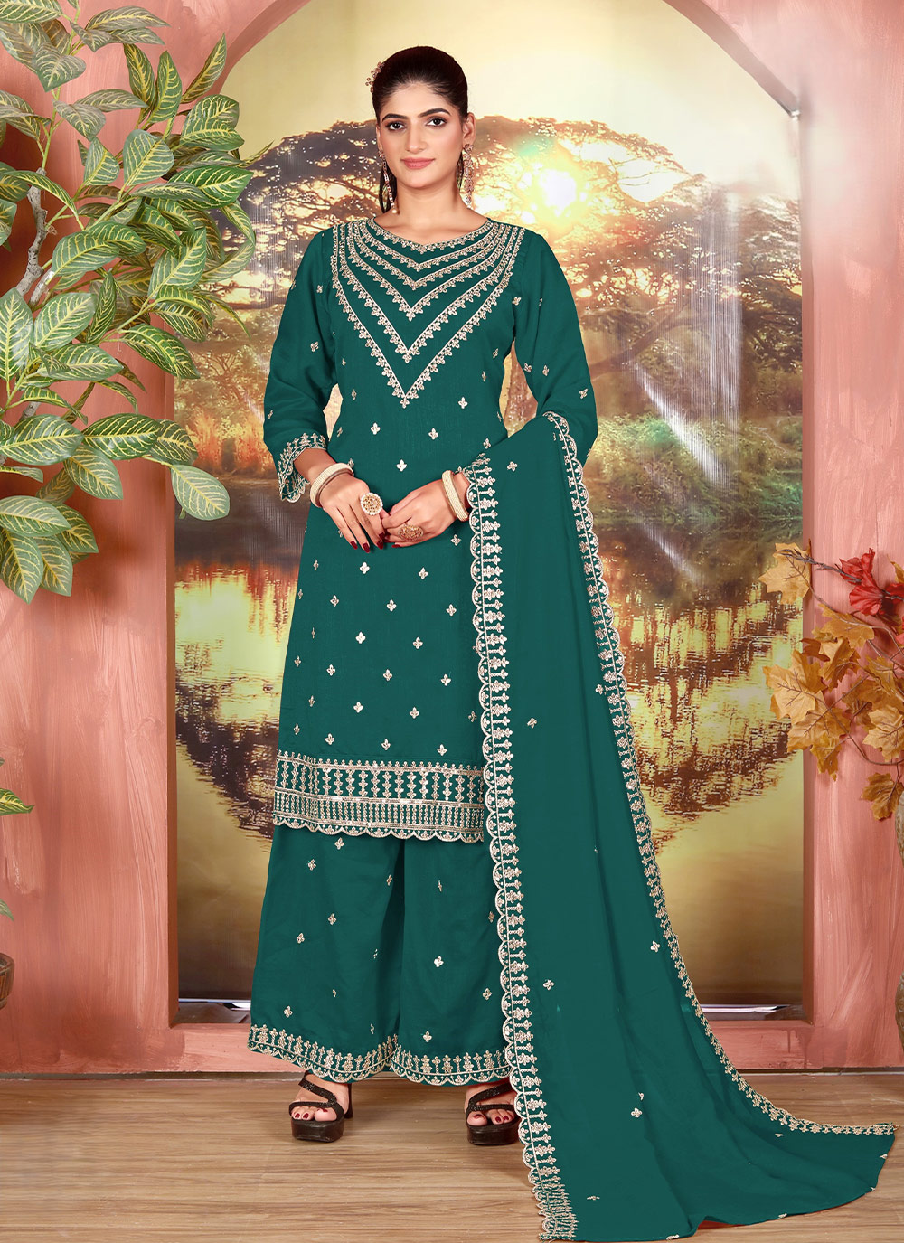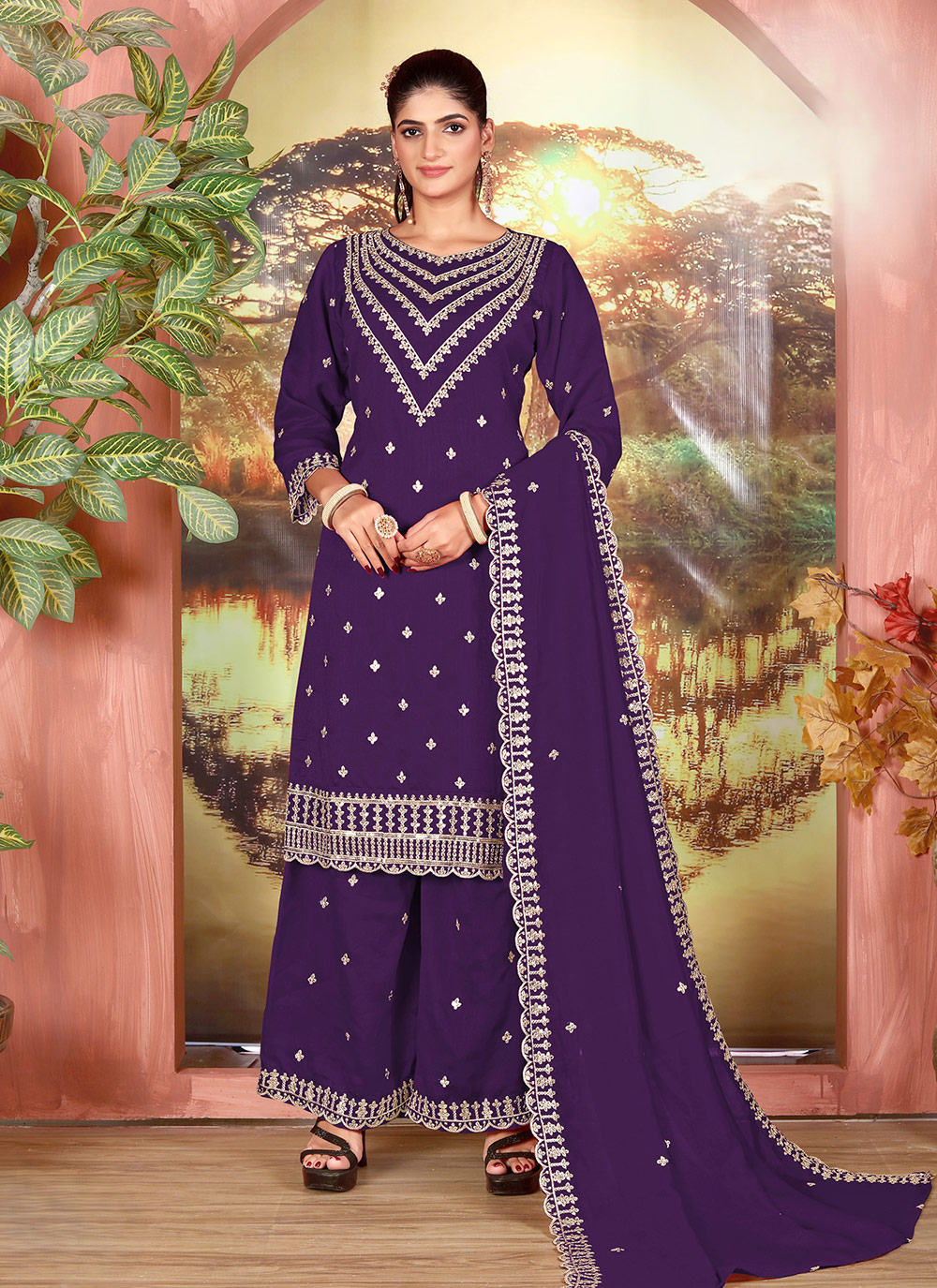 Garb These Party Wear Designer Plazzo Suits in Fine Colored Pair With Dupatta.These Top Are Vichitra And Dupatta Are Fabricated On Vichitra Pair With Vichitra Bottom.Its Beautified With Designer Embroidery Work.
