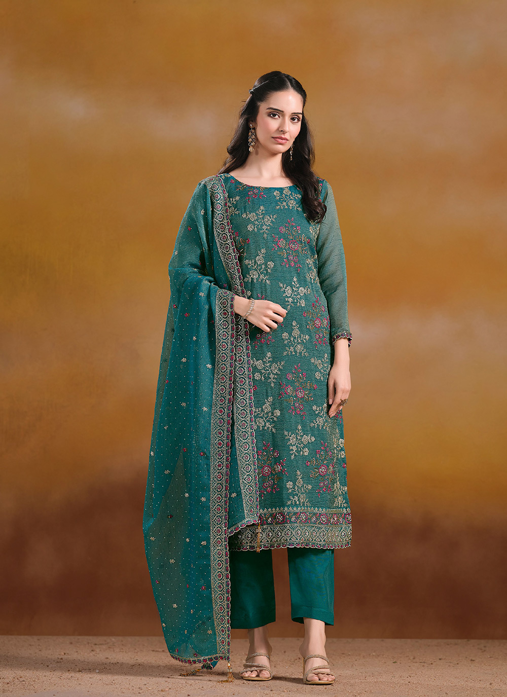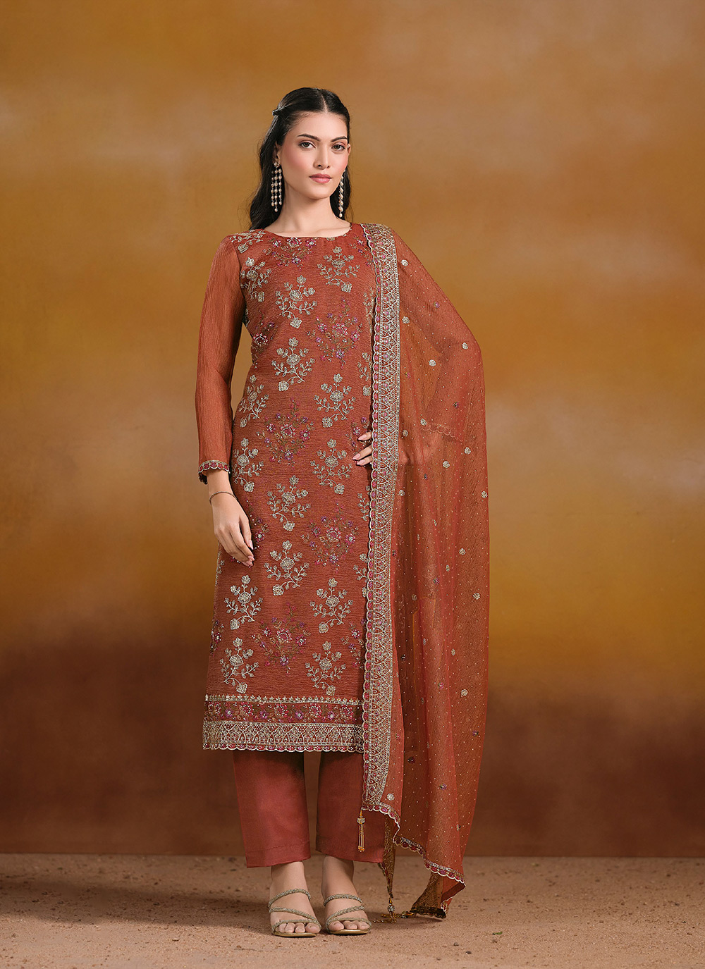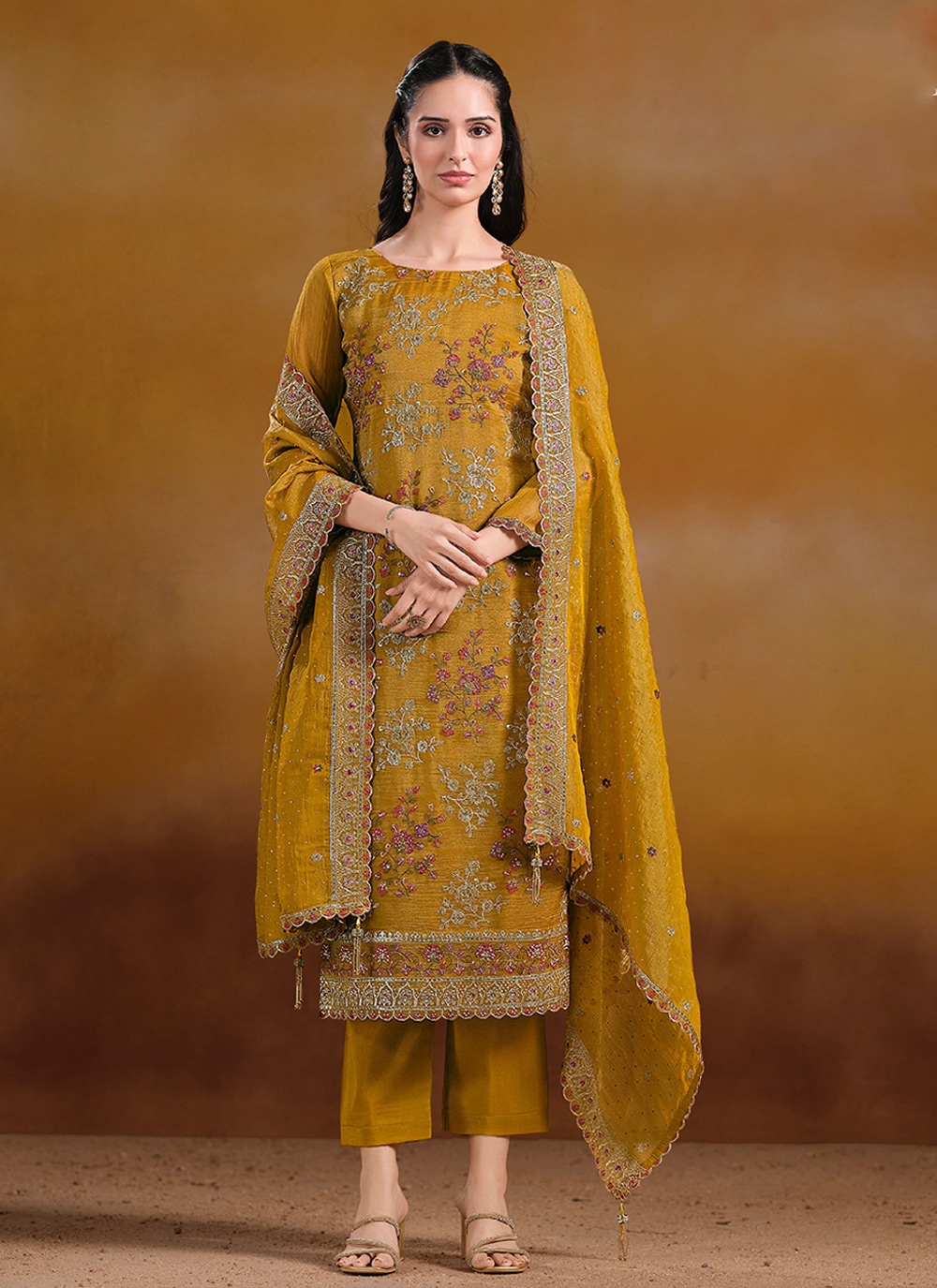 Attractive These Party Wear Salwar Suit in Fine Colored Pair With Bottom And Dupatta.These Top And Dupatta Are Fabricated On Gold Crinkle Organza Chiffon Pair With Santoon Bottom.Its Beautified With Designer Embroidery With Zarkan Work.