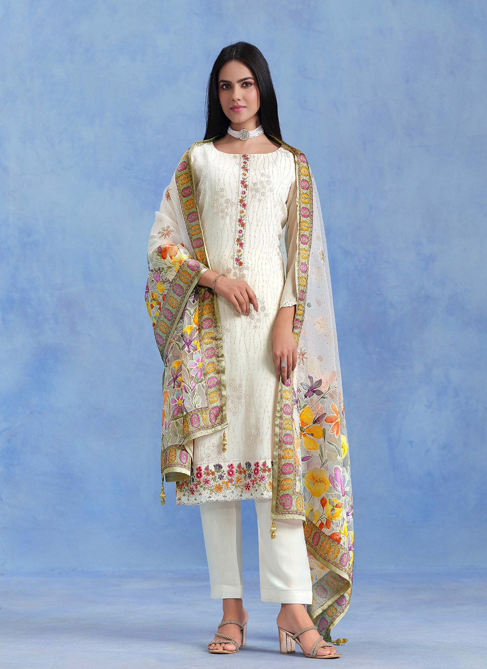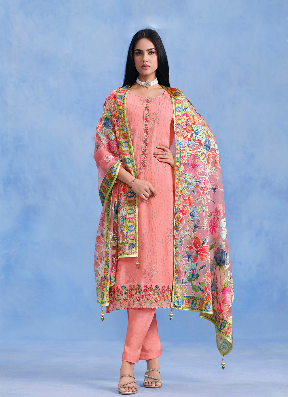 Attractive These Party Wear Salwar Suit in Fine Colored Pair With Bottom And Dupatta.These Top Are Catonic Georgette And Dupatta Are Fabricated On Organza Pair With Santoon Bottom.Its Beautified With Designer Thread Embroidery,Swarovski Work With Digital Brasso Printed Dupatta.