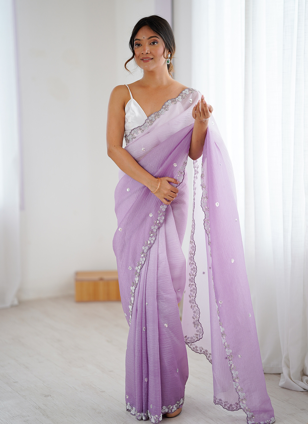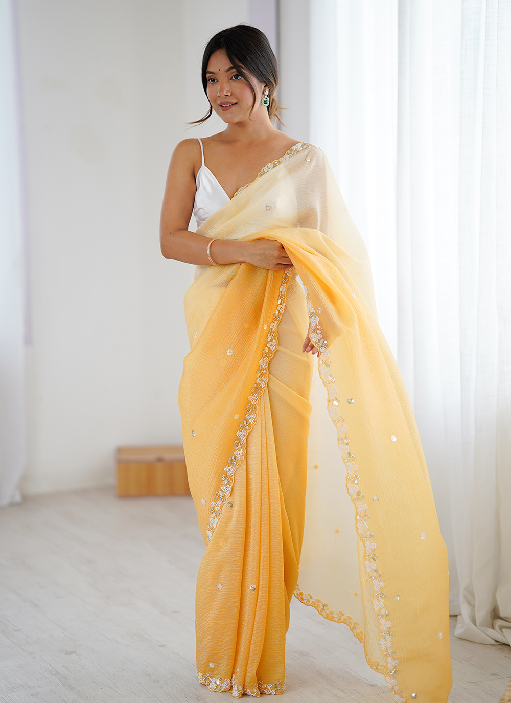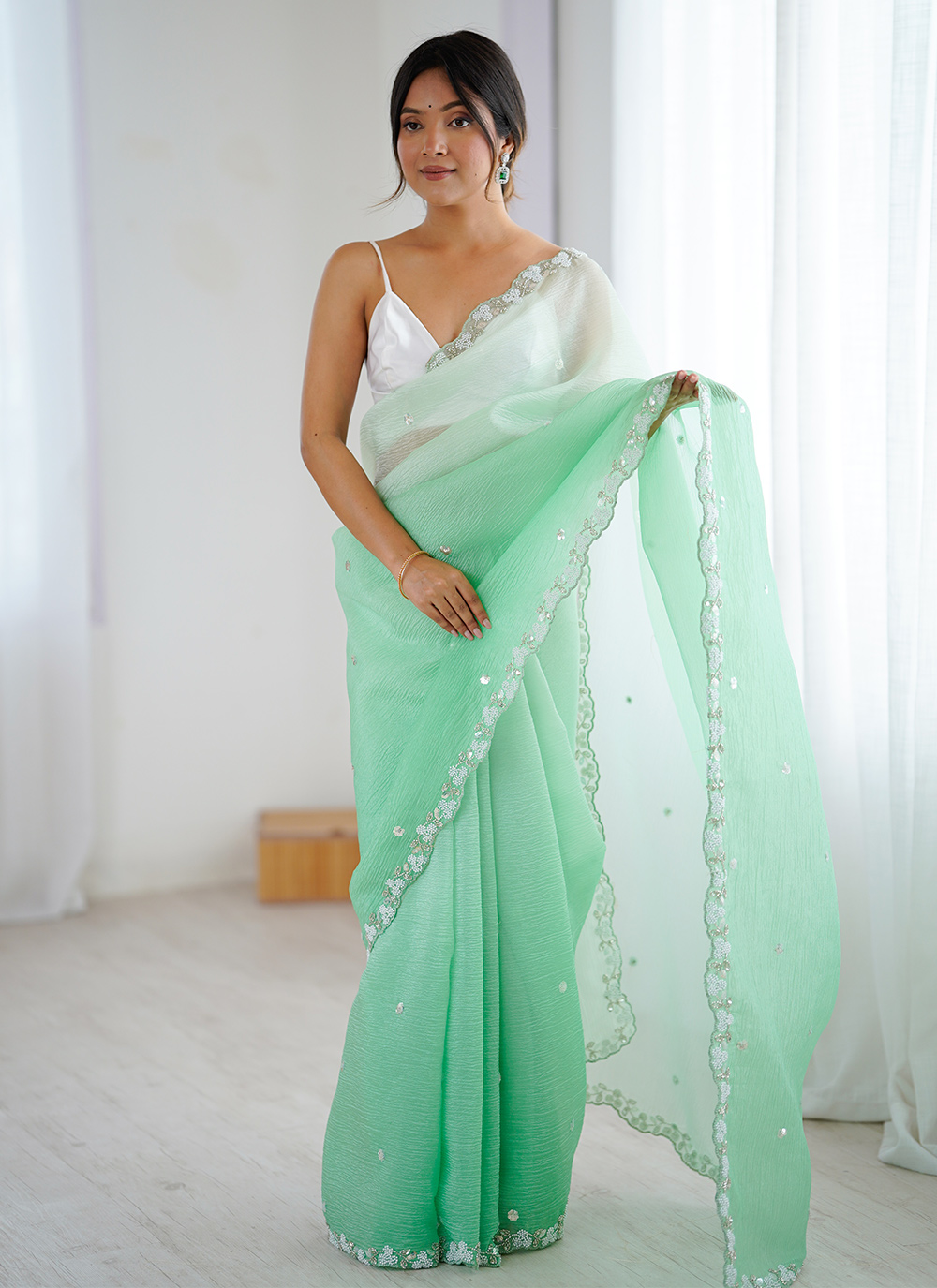 Looking These Party Wear Saree in Fine Sheded Colored.These Saree Are Chiffon Crush And Blouse is Ultra Satin Fabricated.Its Beautified With Sheded Color With Designer Sequance,Moti Cut Dana Work.