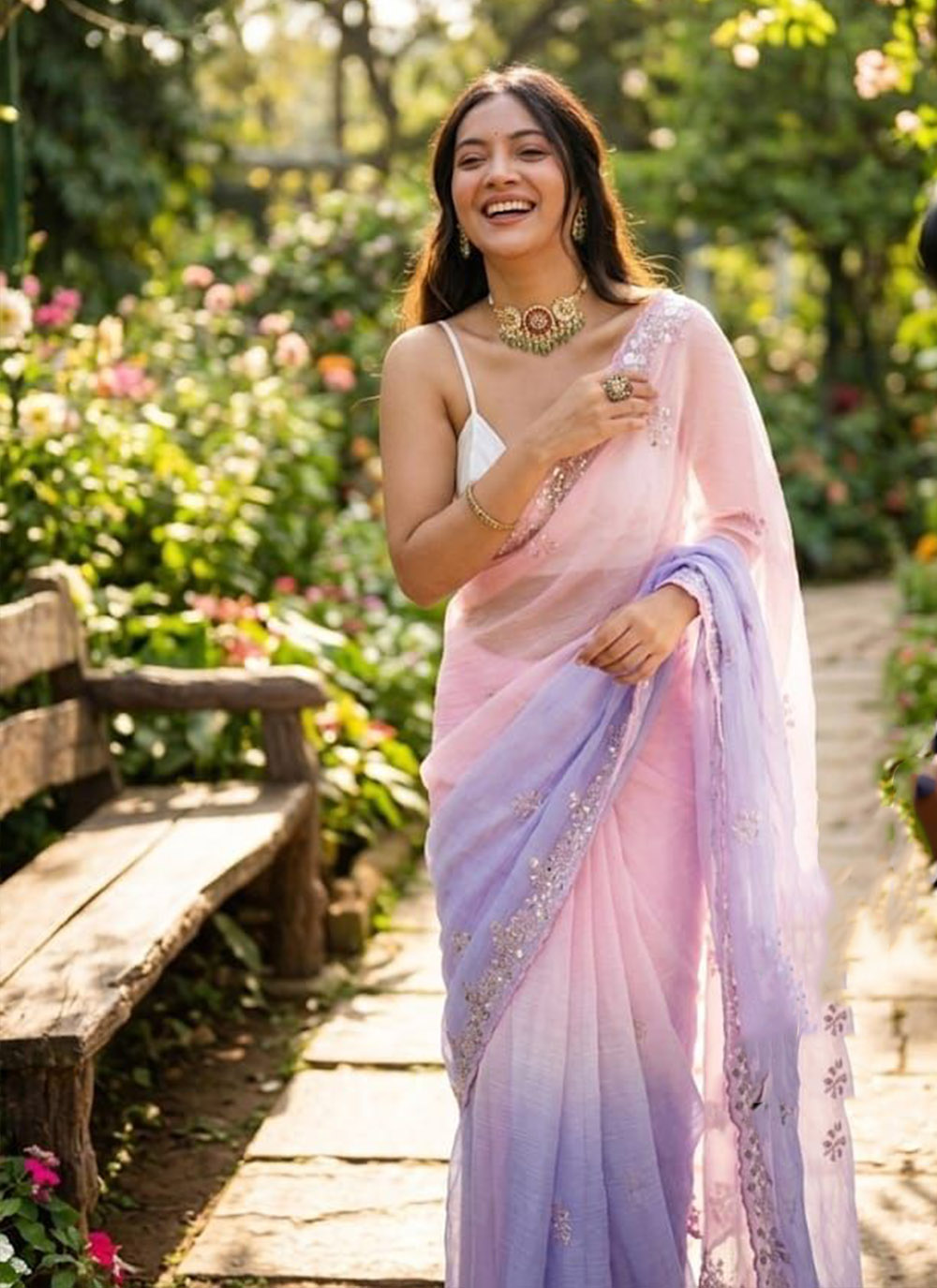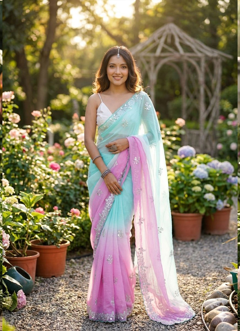 Looking These Party Wear Saree in Fine Sheded Colored.These Saree Are Pixal Crush And Blouse is Satin Fabricated.Its Beautified With Designer Sequance,Moti,Cut Dana Embroidery Work.
