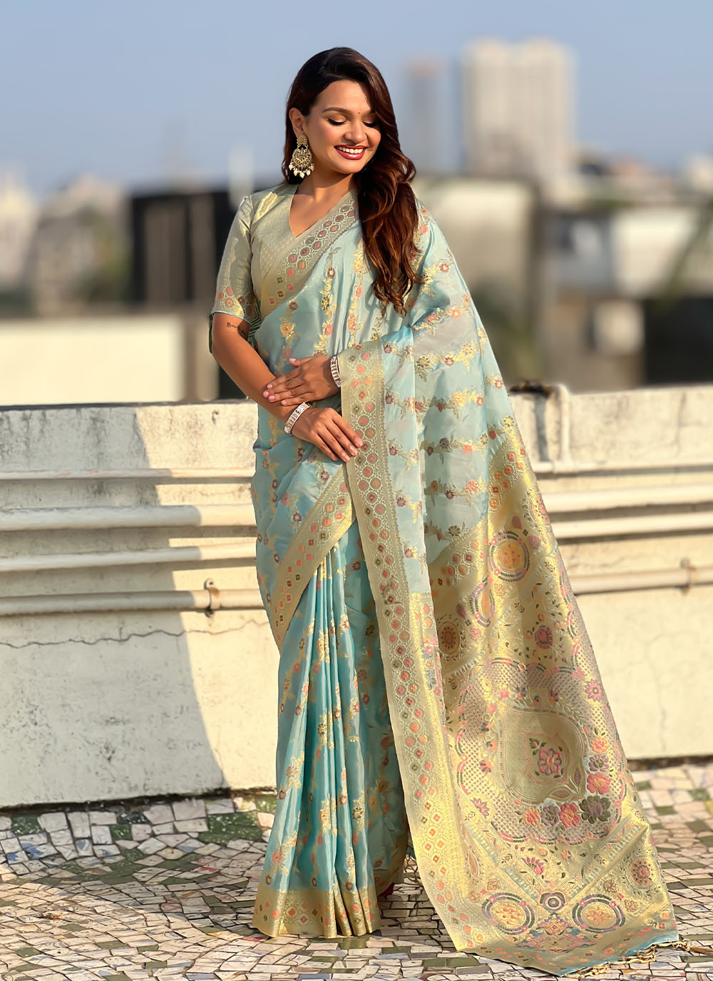 Attractive These Party Wear Fancy Saree in Fine Colored.These Saree And Blouse is Fabricated On Kora Silk.Its Beautified With Woven Laheriya Meenakari Designer.