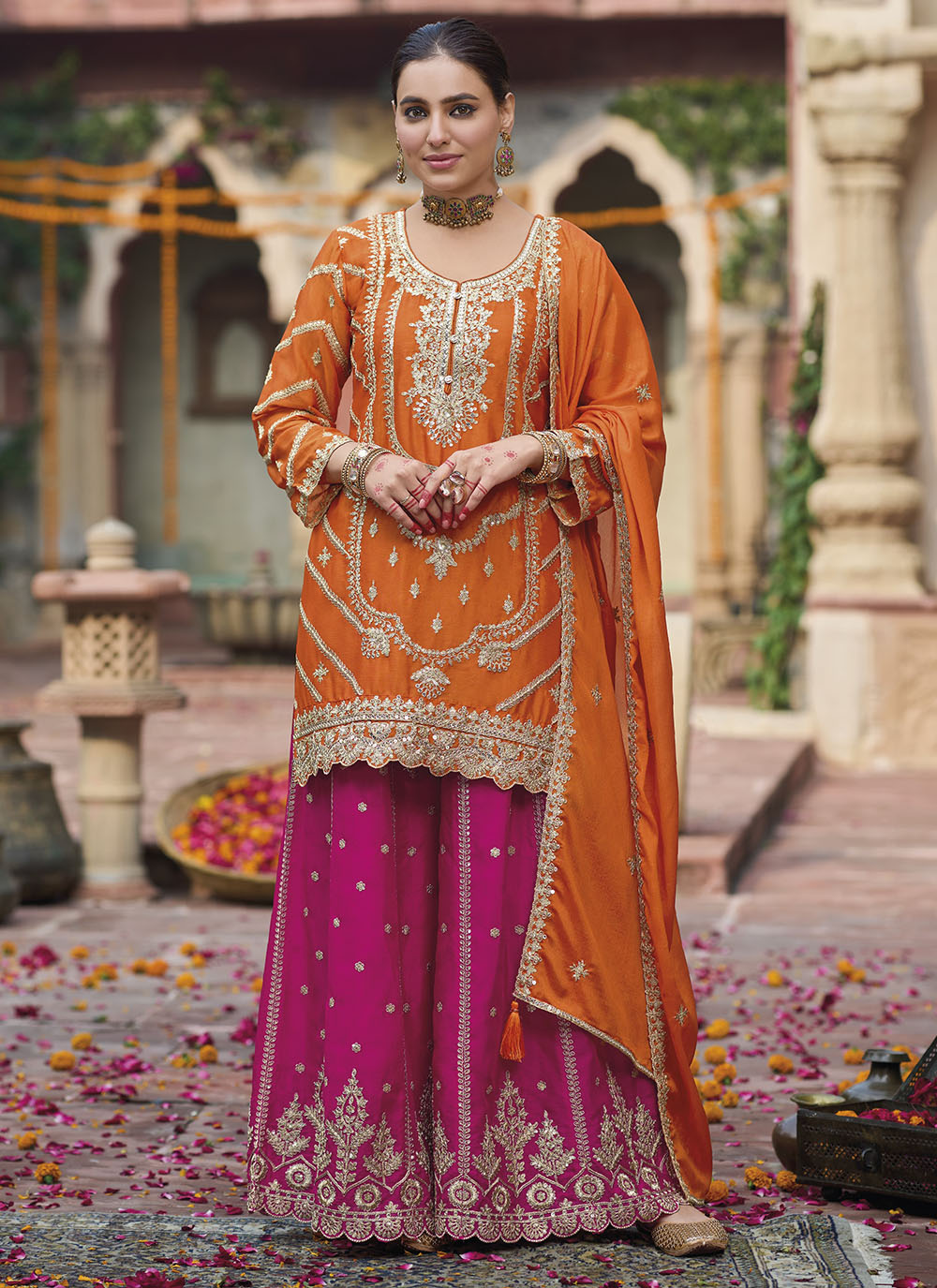 Orange colored palazzo style suit is prettified with Embroidery work and Sequence Work as shown which makes it appear classy. This top is made of Chinon fabric which is accompanied with Chinon Bottom,Chinon dupatta and Santoon Inner. Women can buy this suit to wear for their parties and functions.