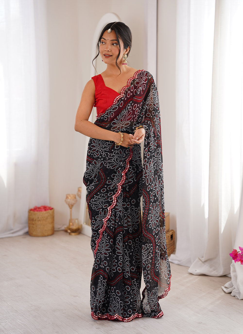 Attractive These Party Wear Saree in Fine Colored.These Saree Are Georgette And Blouse is Mono Banglori Fabricated.Its Beautified With Designer Bandhani Printed With Mirror Cut Work Border.