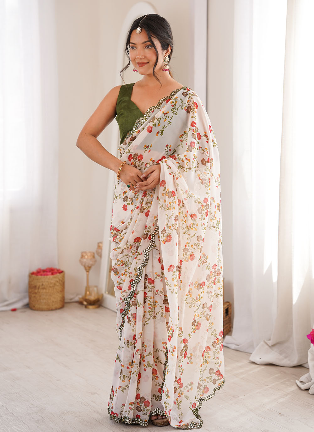 Garb These Party Wear Saree in Fine Colored.These Saree Are Georgette And Blouse is Mono Banglori Fabricated.Its Beautified With Designer Floral Printed With Mirror Cut Work Border.