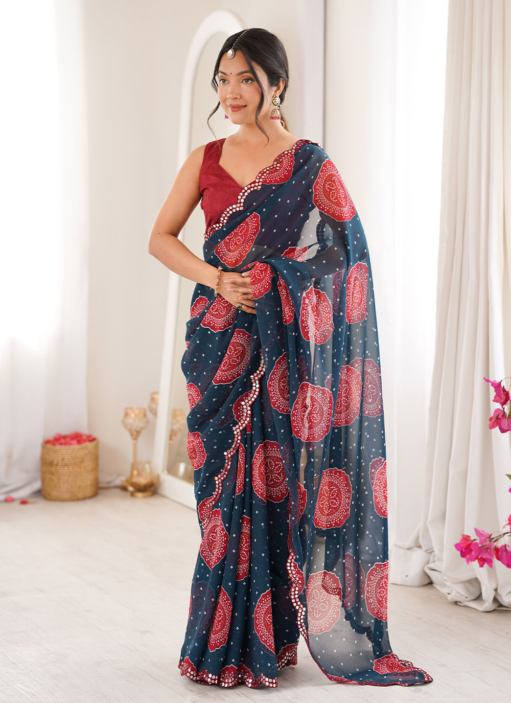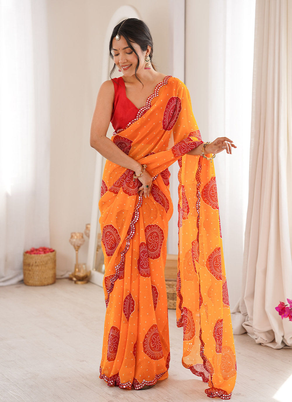 Looking These Party Wear Saree in Fine Colored.These Saree Are Georgette And Blouse is Mono Banglori Fabricated.Its Beautified With Designer Bandhani Gola Printed With Mirror Cut Work Border.